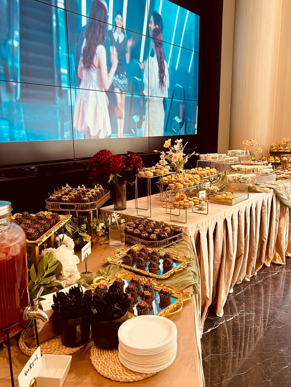 更重要的是,自助式餐會非常適合搭配主題。像是「金色派對」、「公司色系」、「品牌形象牆」等,都能從餐桌佈置、甜點配色一路延伸。當員工拿著飲料與甜點在餐檯前合照,照片上傳到社群,除了是員工的開心紀錄,也默默替公司做了漂亮的品牌露出。