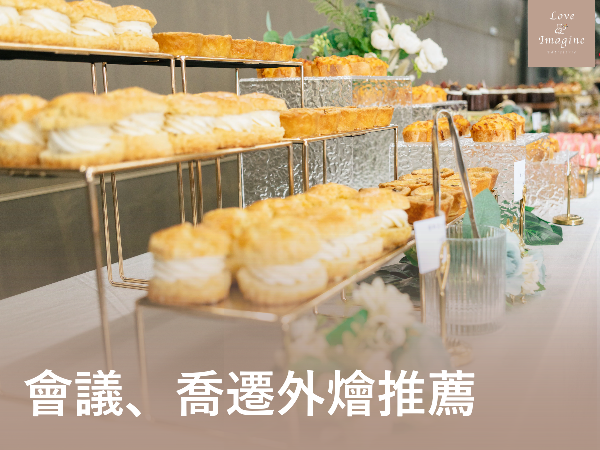 這時候,專業的到府外燴服務就能展現差異。以愛想像的外燴餐點為例,不僅有著法式甜點精緻的外觀,還能依照人數、時段與會議需求來調整份量。同時追求風味表現的每一份點心,都會考慮到口感與質感的平衡。在甜點桌上,從甜而不膩的蛋糕捲、精巧卻飽滿的可麗露、到能夠滿足口腹之慾的鹹可頌通通有,甚至連擺盤都像精品展覽般整齊有序。